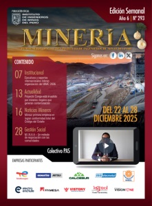 21 AÑO 6 - Nº 293 / DICIEMBRE 2025 innovación, la sostenibilidad y el fortalecimiento de una minería responsable en el Perú. “Del 15 al 19 de junio del próximo año en Trujillo fomentaremos un auténtico intercambio de conocimientos y experiencias profesionales entre los expertos de la minería para analizar los desafíos y oportunidades que marcarán el futuro de la industria minera nacional”, puntualizó. En las palabras de clausura, el presidente del Instituto Geológico, Minero y Metalúrgico, Luis Humberto Chirif felicitó al Consejo Directivo del Capítulo por todo el despliegue realizado a lo largo del año con las conferencias de los Martes de la Minería. “Esperamos que el próximo año la minería tenga más éxito que este 2025, minimizando en forma multisectorial los conflictos e impulsando el desarrollo territorial”, manifestó.